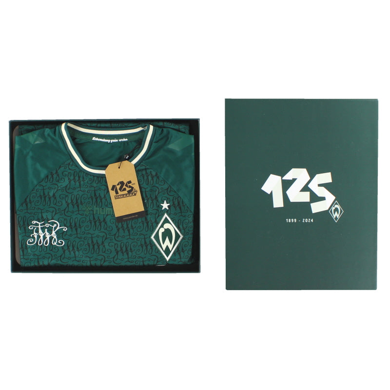 Unveiled under the campaign header United Through History, Werder Bremen have kicked off their 125th anniversary by revealing a special edition shirt. The shirt is designed in a deep green color, featuring a tonal graphic of the founding logo from 1899. This historic crest is positioned on the right side of the chest, opposite the current crest on the left, below which the text 1899-2024 is displayed. The Hummel branding is centrally placed in a deep tonal green, harmonizing with the sponsor logo, which also blends seamlessly into the design without detracting from the overall aesthetics.