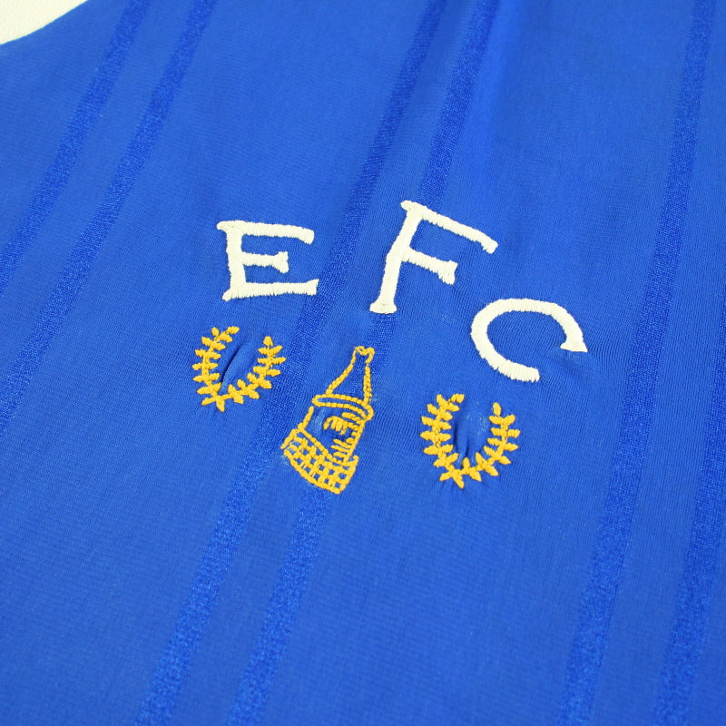 Details - Home shirt as worn when Everton finished 7th in the First Division in the 1983-84 season before winning the First Division title in the next season under Howard Kendall, finishing 13 points clear of second placed Liverpool. Also worn when Everton made it to the FA Cup final in back to back seasons, beating Watford 2-0 in the final in the 1983-84 season before failing to retain their title in the next season, losing 1-0 against Manchester United.