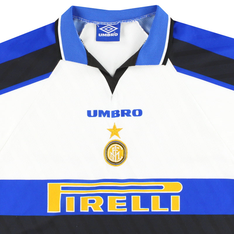 Details - Away shirt as worn when Inter Milan finished 3rd in Serie A, finishing 6 points behind champions Juventus, and were knocked out in the semi finals of the Coppa Italia, losing 5-3 on penalties against Napoli after the tie finished 2-2 on aggregate. Also worn when Inter made it to the final of the UEFA Cup where they lost 4-1 on penalties against Schalke after the tie finished 1-1 on aggregate.